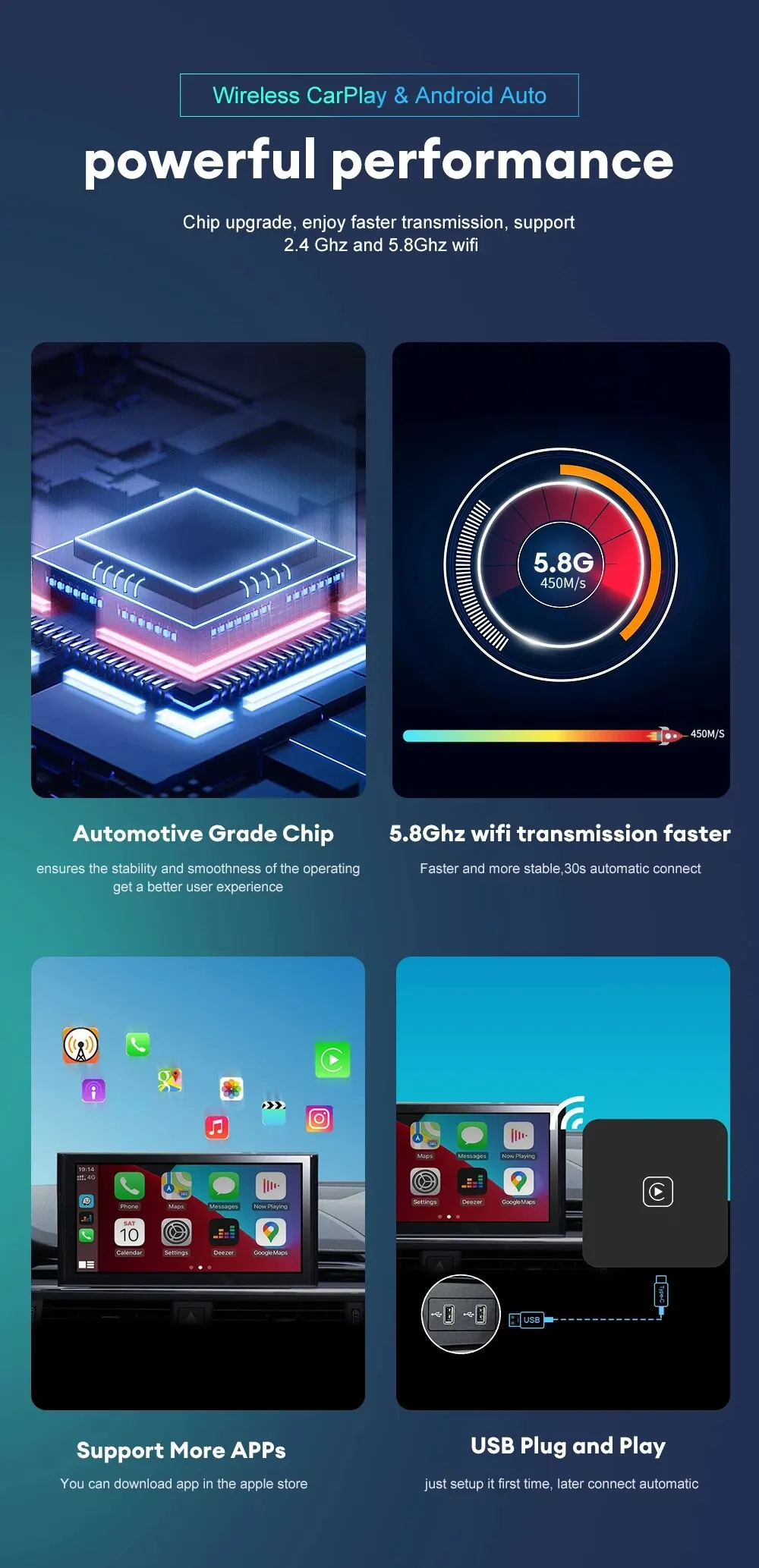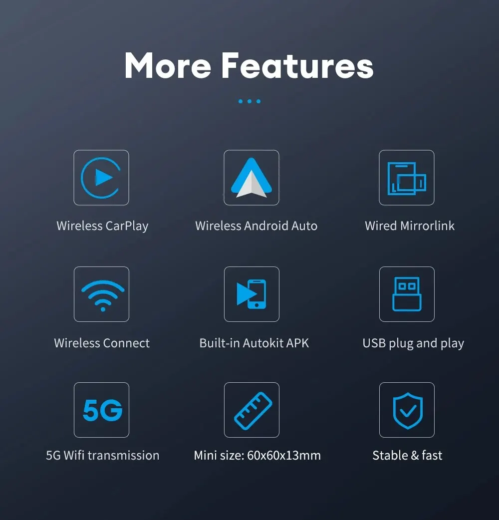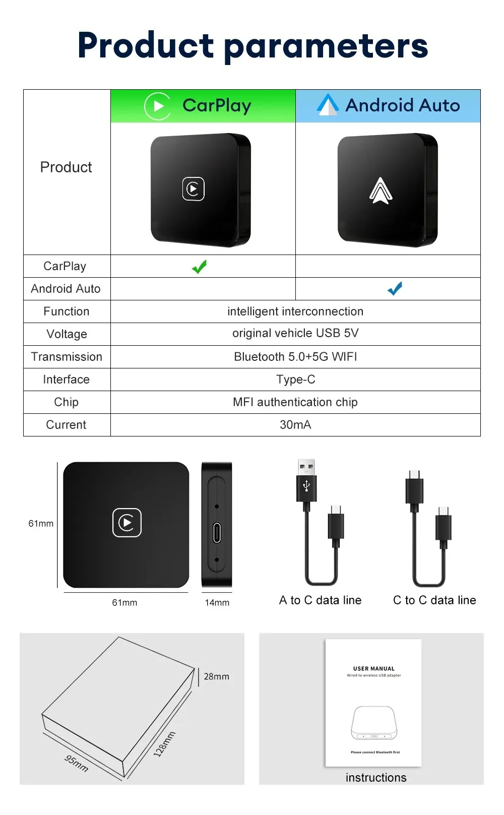 • Carplay and Auto Box Integration :Connect your phone to your car's infotainment system seamlessly with the Mini Carplay&Auto Box Dongle.