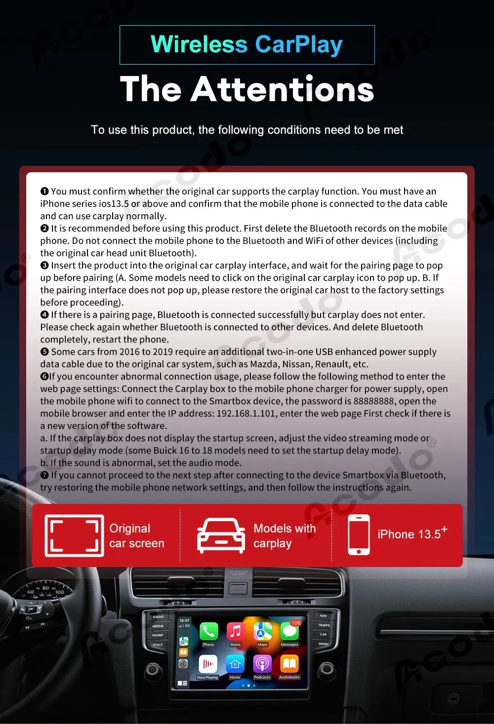 1.Before buying, please check your original car has a built-in wired cable to connect to CarPlay