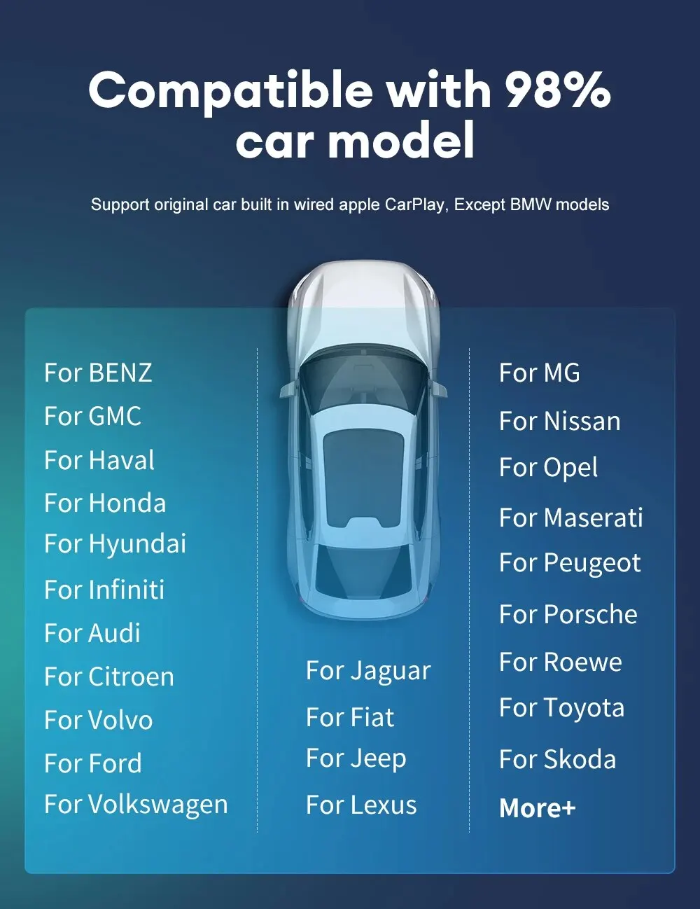 • Compatibility with Multiple Car Brands :The Mini Carplay&Auto Box Dongle is compatible with a wide range of car brands, including Audi, Toyota, Mazda, Nissan, Chevrolet, Suzuki, Subaru, Kia, Ford, Opel, Skoda, and Hyundai.